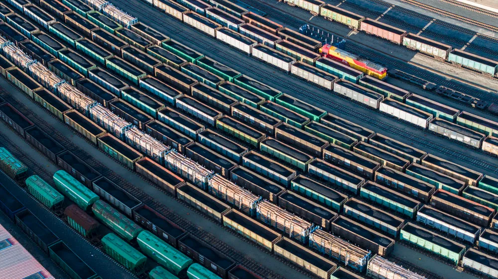 2025年10月18日,在中国铁路哈尔滨局集团有限公司绥芬河站南场,满载进口货物的列车等待解体换装(无人机照片)。新华社发(曲艺伟 摄)