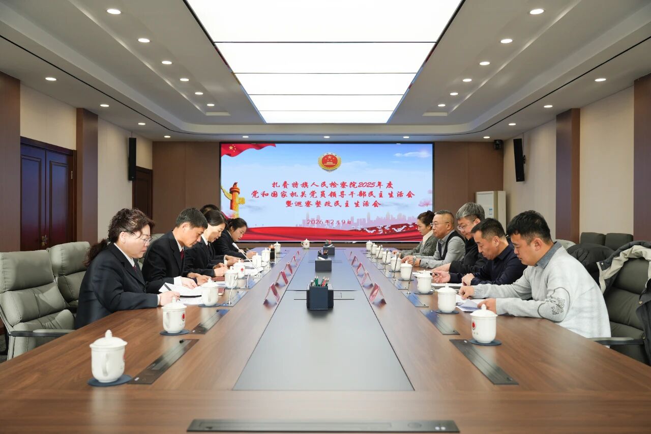 2月9日,扎赉特旗检察院召开2025年度民主生活会暨巡察整改专题民主生活会。兴安盟检察分院党组成员、副检察长潘勇,旗委第五督导组组长、旗委组织部副部长齐文学,旗委政法委三级调研员包额尔敦到会指导。扎赉特旗检察院党组书记、检察长迟文主持会议,院领导班子成员参加会议。