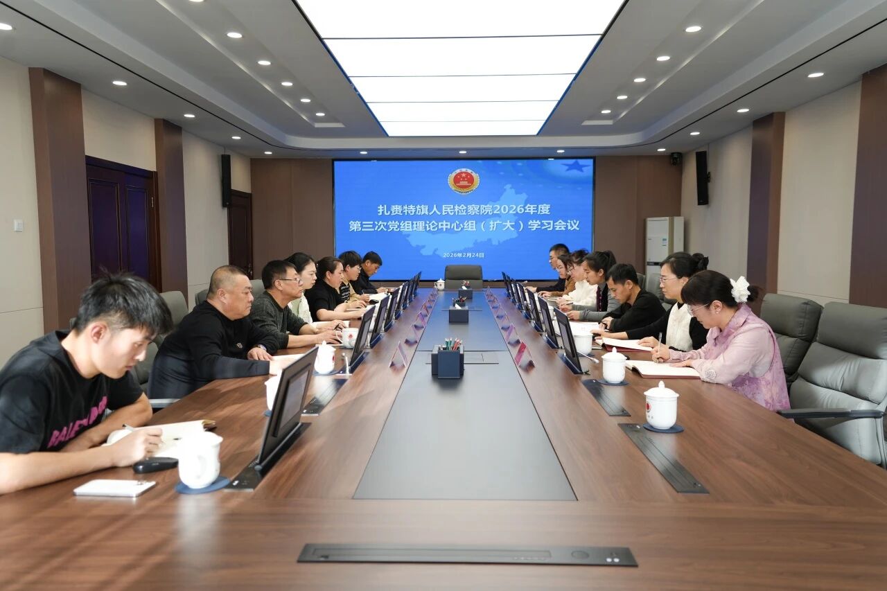 2月24日,扎赉特旗检察院召开2026年第三次党组理论中心组学习会,传达贯彻中央、自治区党委、兴安盟委政法工作会议精神和全国检察长会议、全区检察长会议精神,学习贯彻《中国共产党党组工作条例》《公务员奖励规定》等内容,并就“八严格”相关规定进行了专题学习及研讨。扎赉特旗检察院领导班子成员、检委会专职委员及各部门负责人参加。